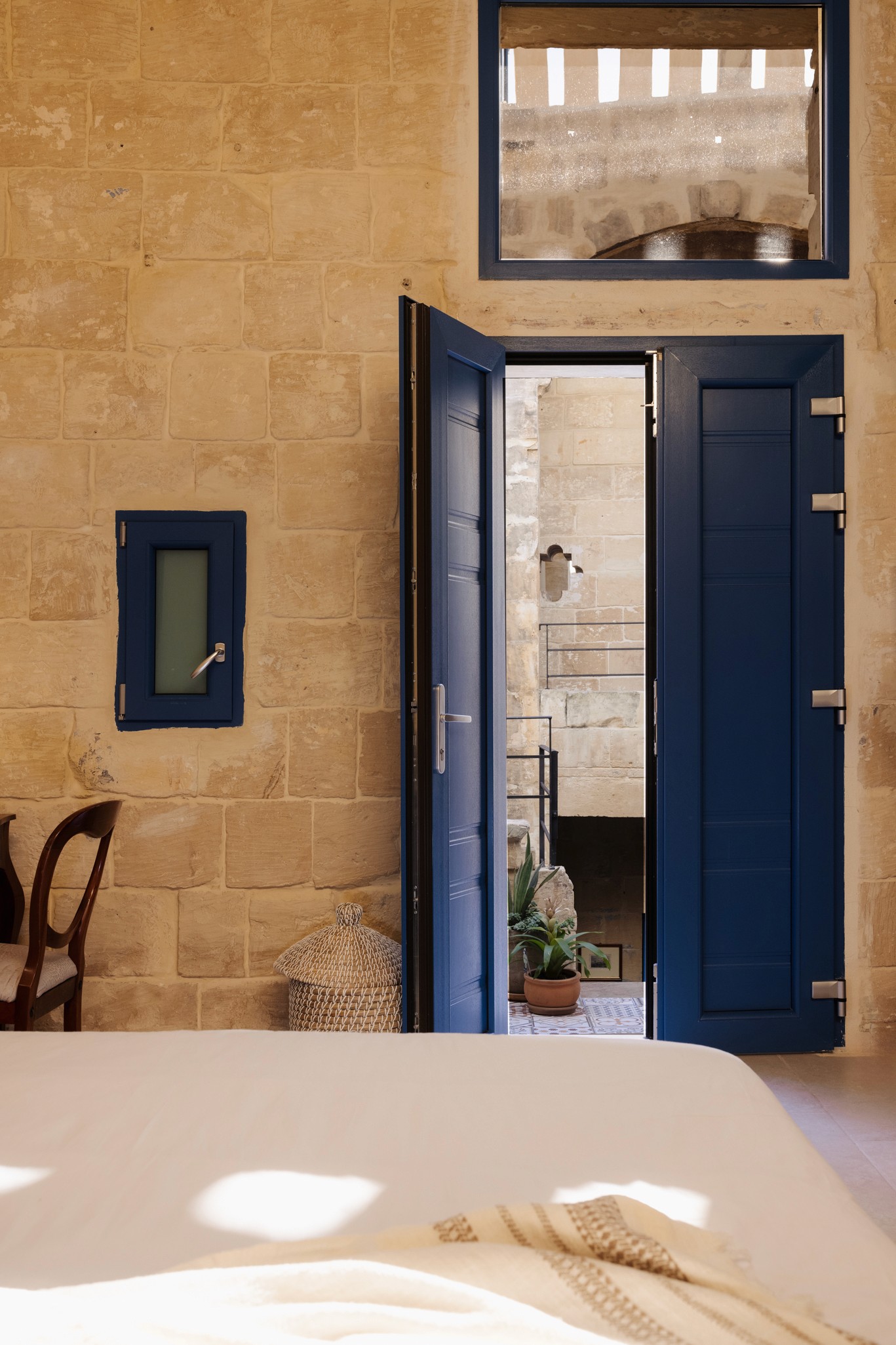 This room features a double-height ceiling, giving it a bright and spacious feel. The design blends traditional Maltese limestone walls with modern elements, including a private terrace area accessible by a sleek staircase. The room includes a comfortable queen-size bed, a seating area, and a private terrace, perfect for enjoying fresh air and natural light. Thoughtfully furnished with a mix of classic and contemporary pieces, this space offers both character and comfort for a relaxing stay.