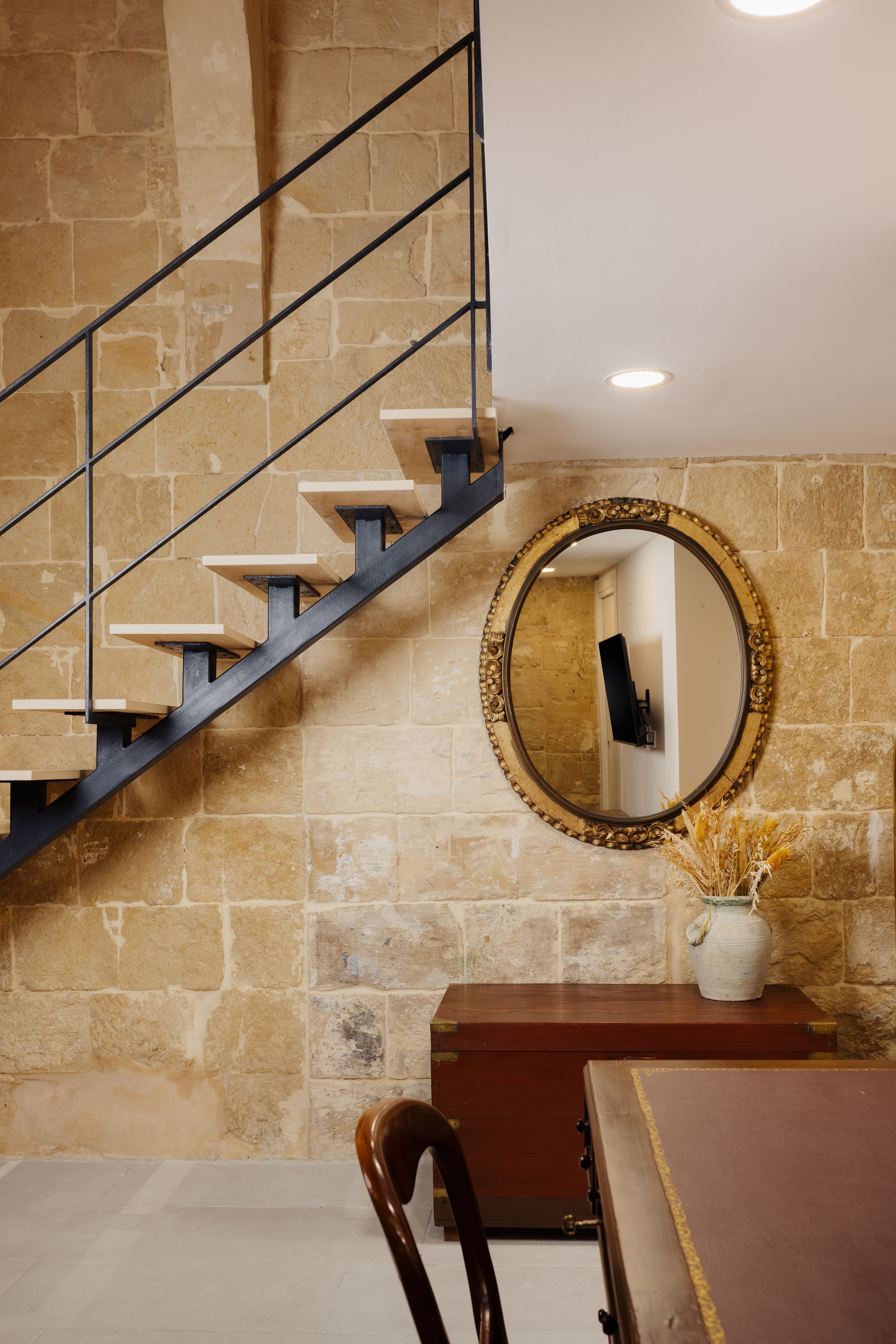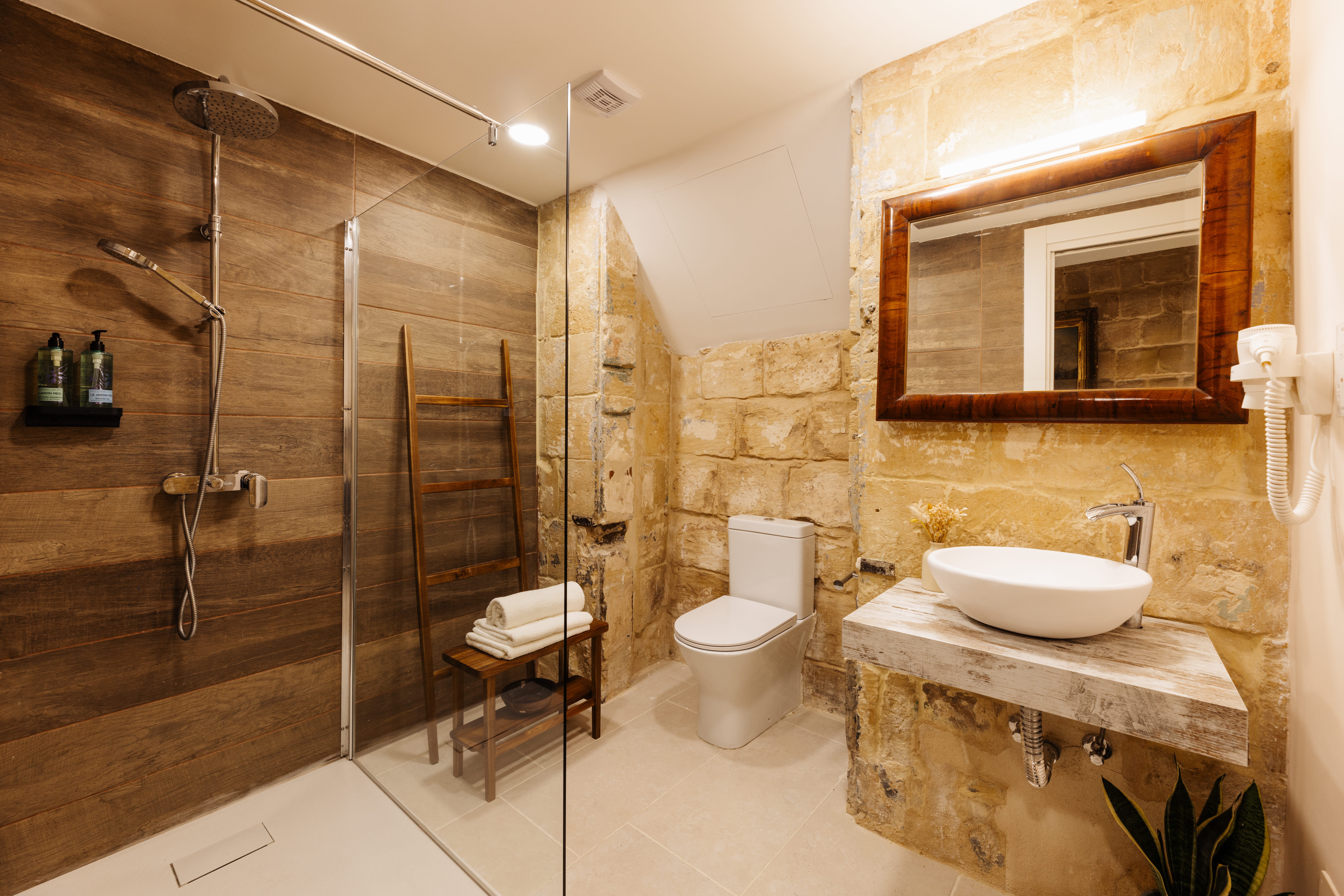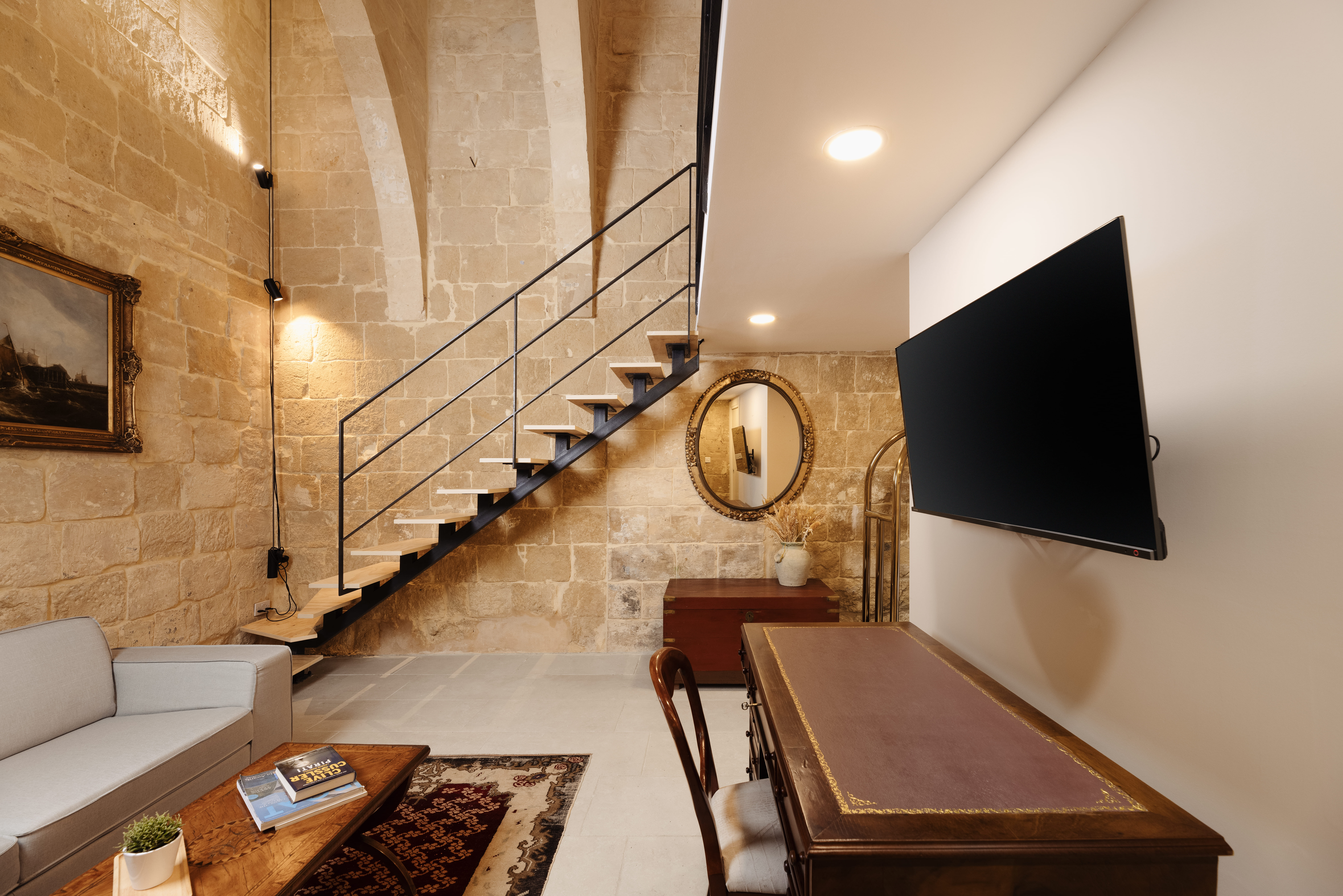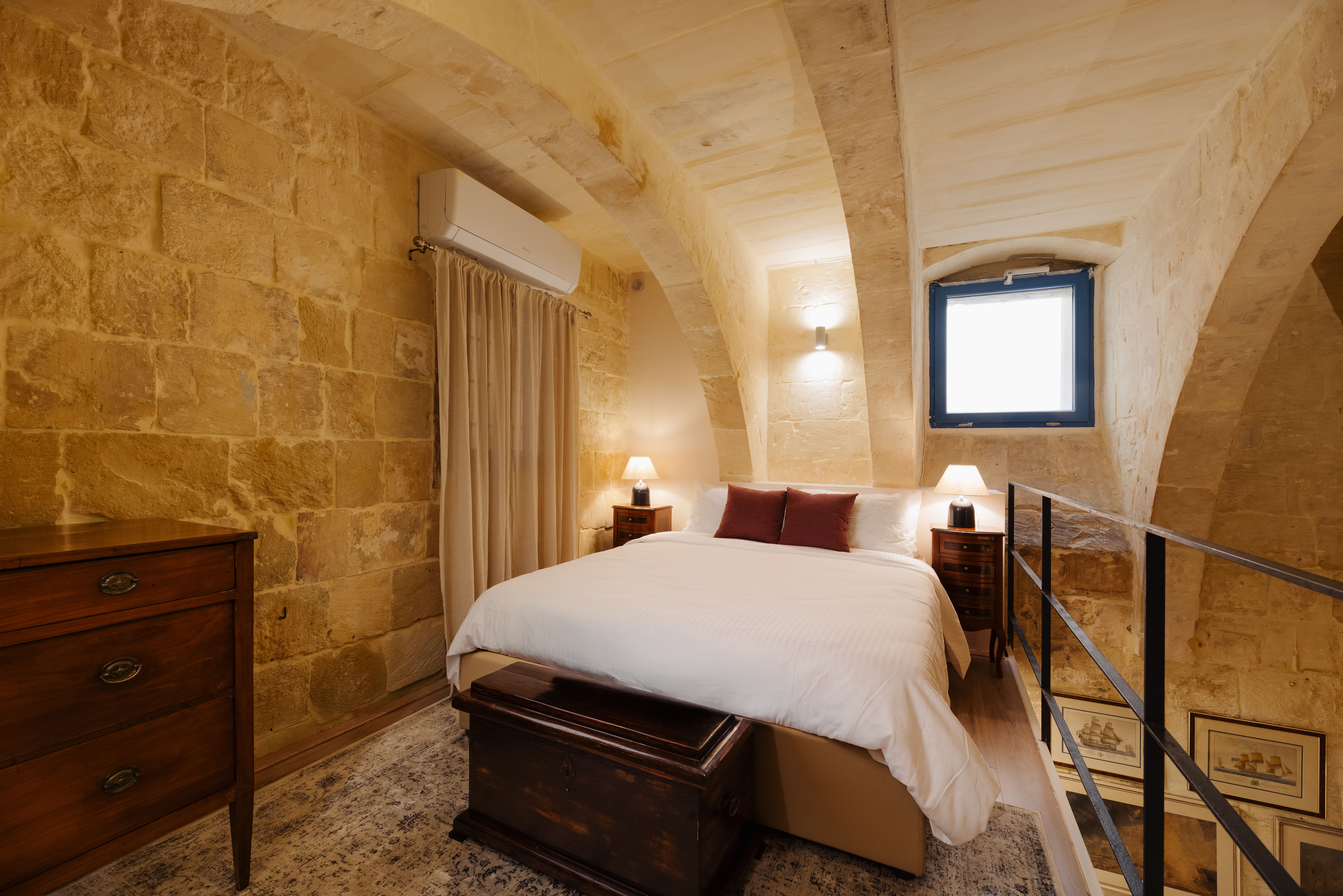 This spacious suite features high vaulted ceilings and traditional Maltese limestone walls, offering a unique and historic setting. The mezzanine sleeping area overlooks a comfortable living space, furnished with soft seating and classic artwork. The suite includes a modern en-suite bathroom suite blending traditional architecture with contemporary comfort. Ideal for guests seeking a peaceful and character-filled stay in a thoughtfully designed space., combining historic charm with contemporary comfort.
